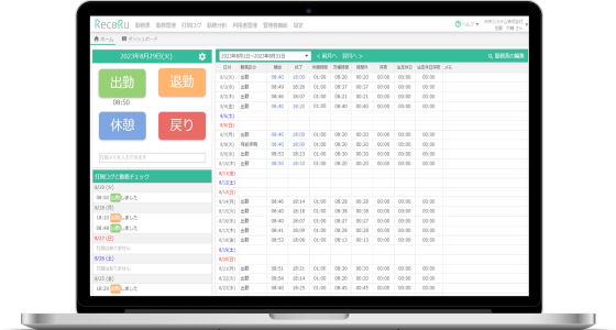 当社のクラウドサービスで最も人気が高いのが、勤怠管理サービスの「レコル」。特長は、月額3,000円から利用できる低価格と、2019年4月から施行された「働き方改革」に対応した各種機能がオプション契約なしで利用できる使いやすさ。タイムカードや手書きの申請、Excelへの手入力作業など、勤怠管理に時間を費やしていた多くのお客様にご利用いただいております。